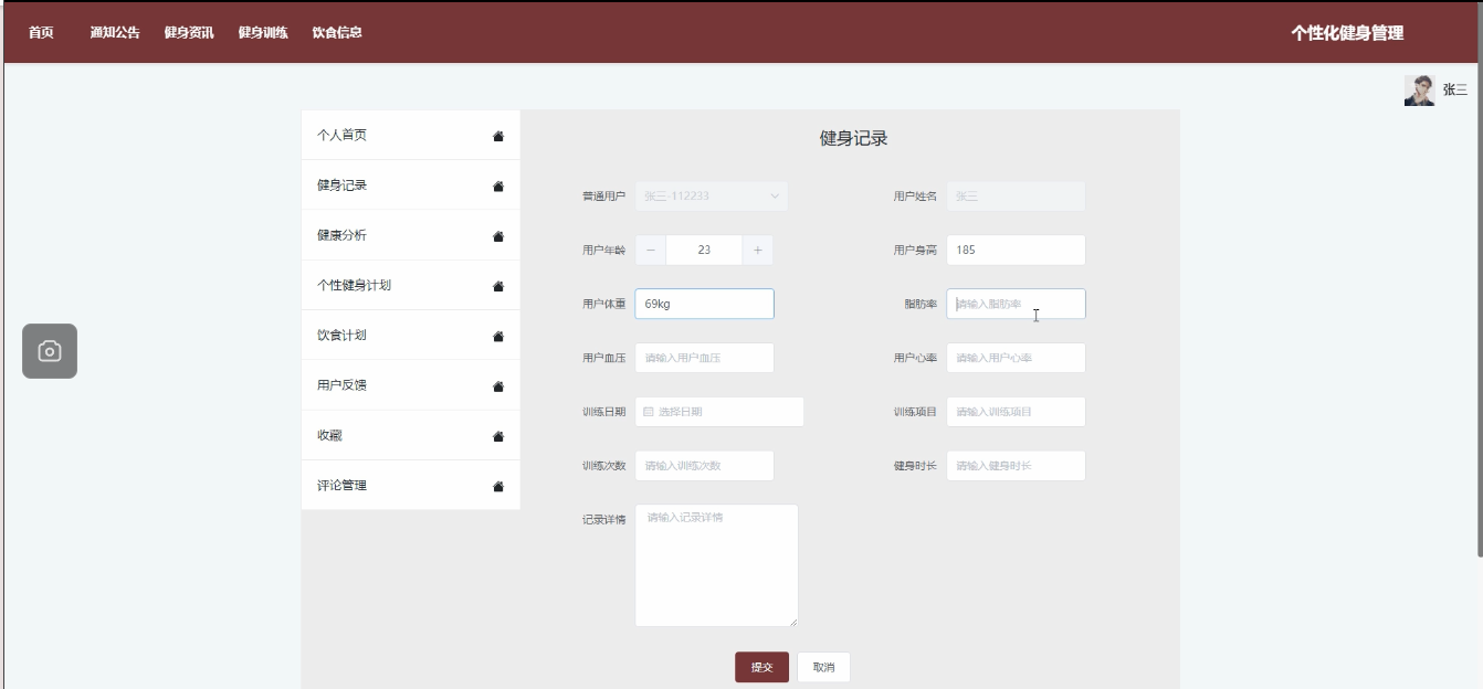 - 个人中心:用户可以查看健康分析、个性健身计划、饮食计划、用户反馈、评论管理、收藏等。