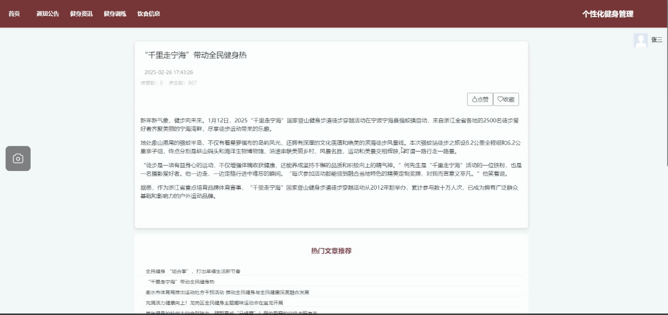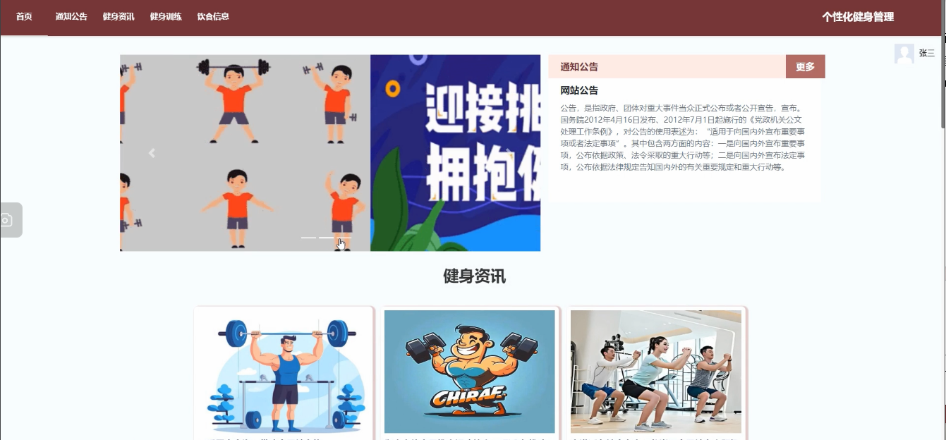 普通用户在首页能够轻松获取最新的公告通知、健身资讯、饮食信息等关键信息,及时把握网站的活动与最新动态。同时,首页还展示了热门及推荐的健身资讯内容,为普通用户提供了便捷的浏览体验。界面展示如下图5-1所示。