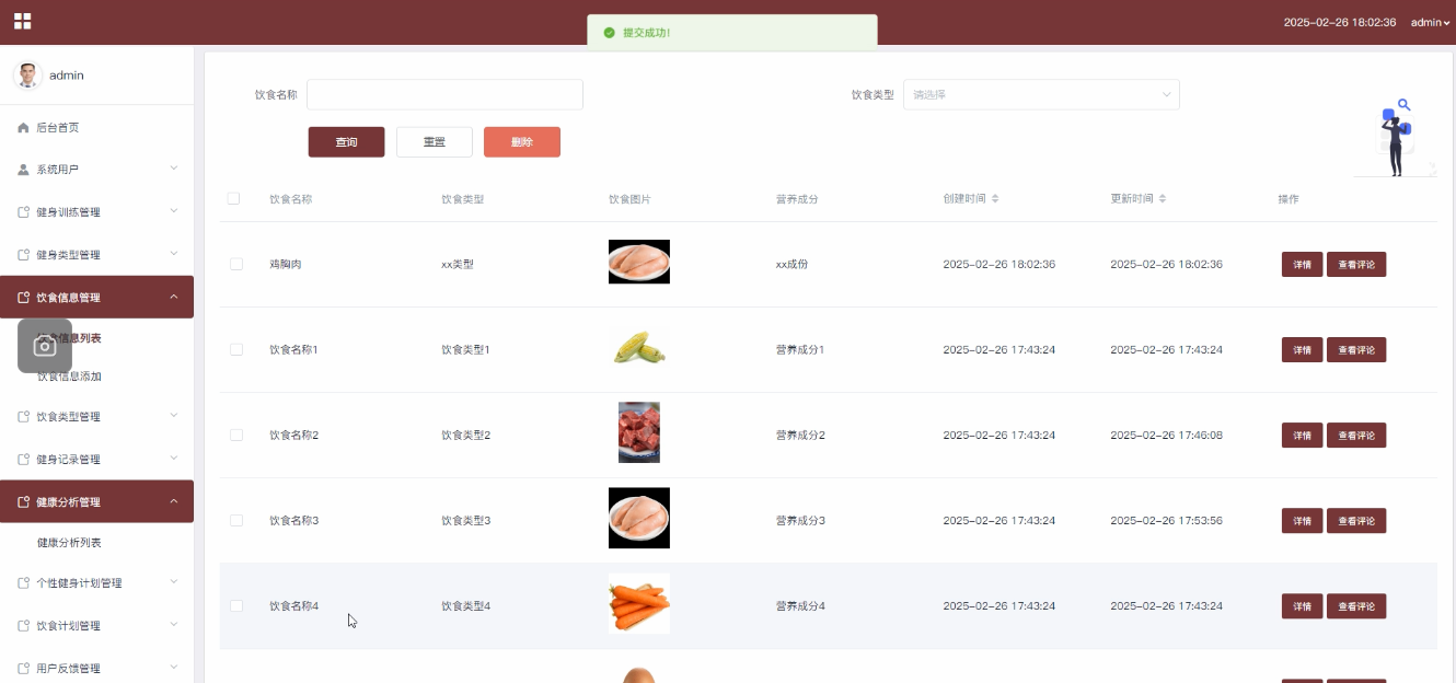 - 饮食信息管理:管理员拥有查看和删除饮食信息列表的权限,同时,也能够添加新的饮食信息,为用户提供个性化的饮食计划,帮助用户合理安排饮食。