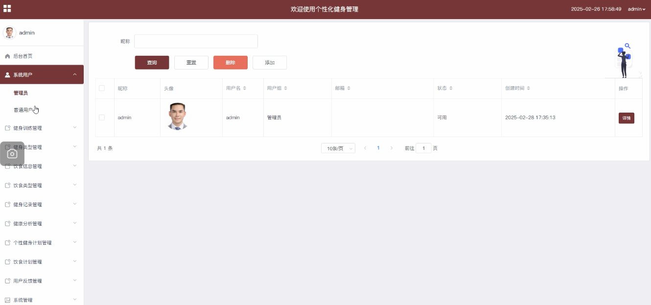 - 个性健身计划管理:管理员拥有查看和删除个性健身计划列表的权限,提供训练强度、频率、时长等个性化建议,也可以添加新的个性健身计划。