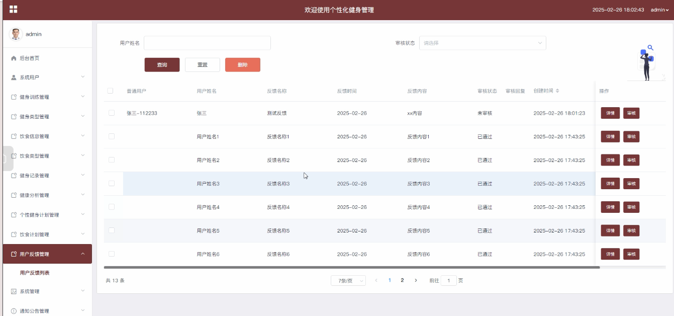 用户反馈管理:管理员拥有查看和删除用户反馈列表的权限,用户可以对智能调整的健身方案进行反馈,系统根据用户反馈进一步优化方案。