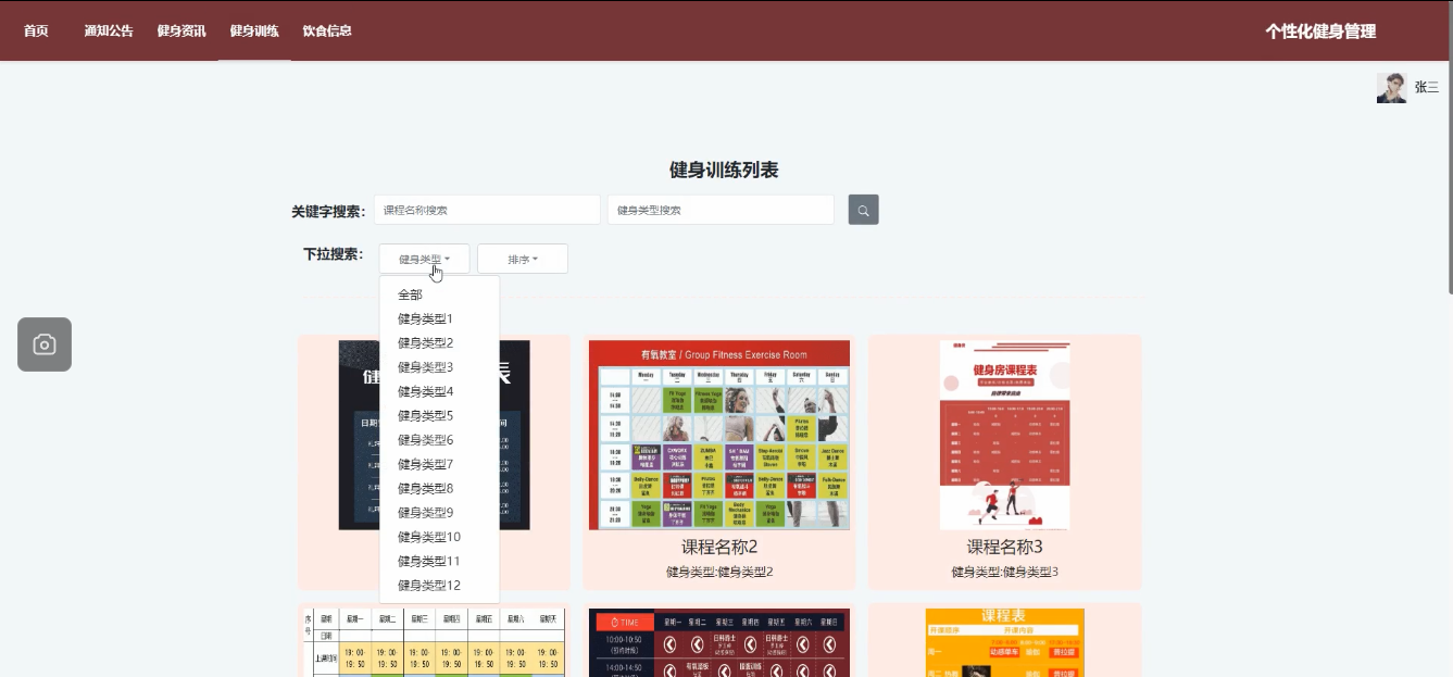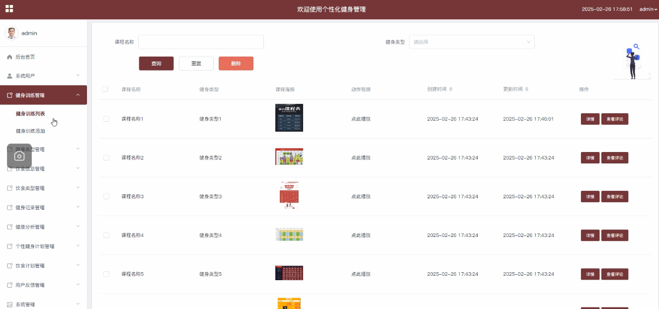 - 健身类型管理:管理员拥有查看和删除健身类型列表的权限,也可以添加新的健身类型。