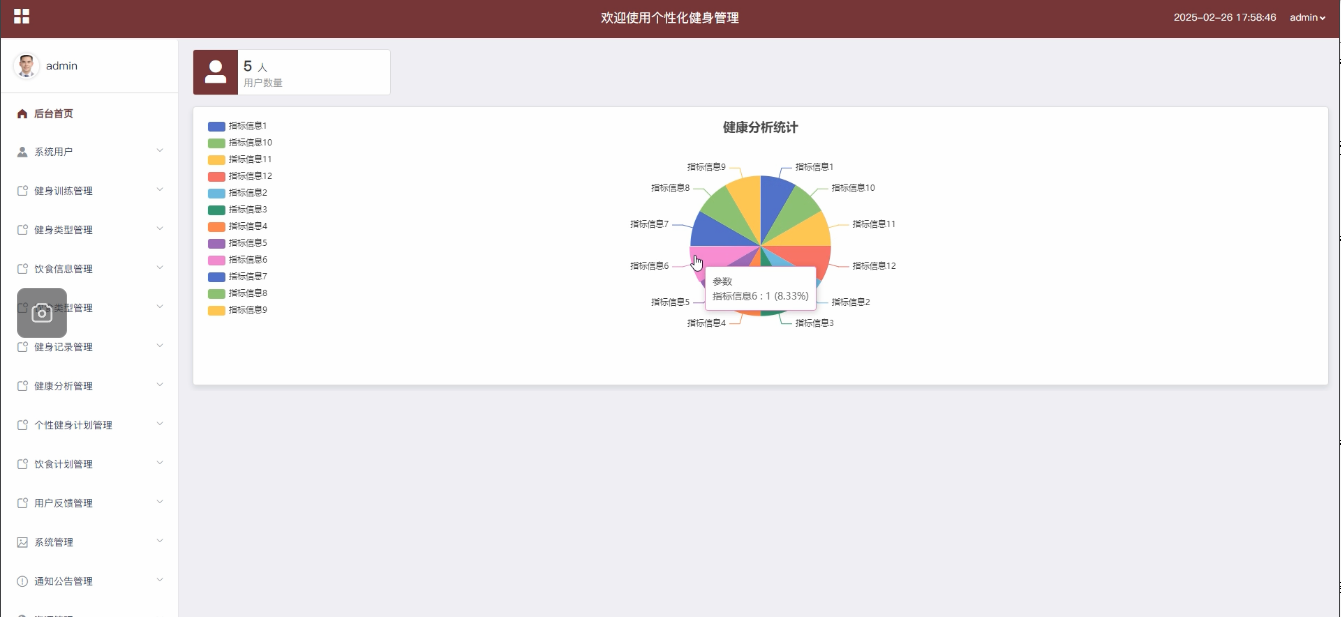 - 后台首页:管理员具备管理个人信息的权限,涵盖编辑个人资料、更换个人头像以及修改账户密码等多项操作,可以查看健康分析统计图。