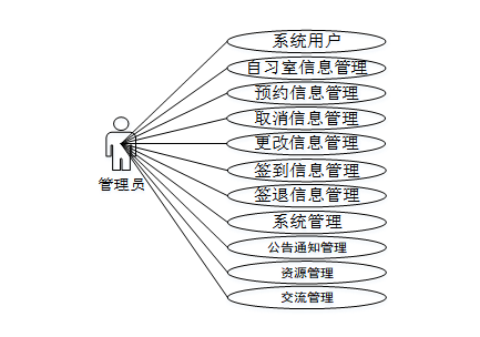 管理员模块功能有:系统用户、自习室信息管理、预约信息管理、取消信息管理、更改申请管理、签到信息管理、签退信息管理、系统管理、公告通知管理、资源管理、交流管理。