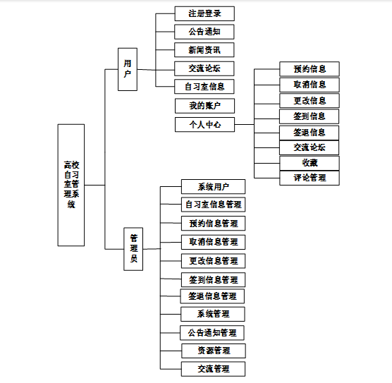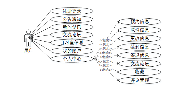 用户模块功能有:首页、公告通知、新闻资讯、交流论坛、自习室信息,我的账户、个人中心。