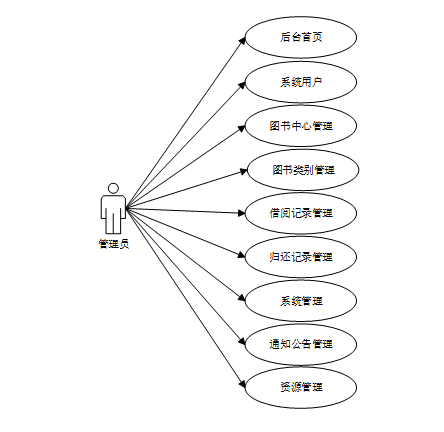 管理员则负责系统的后台维护与管理工作,确保图书馆运营顺畅。其核心用例涵盖对图书资源、用户信息及通知公告的有效管理。例如,管理员需定期更新图书中心的数据,包括添加新到图书、调整库存状态等;同时还要审核用户的借阅和归还请求,保证流程合规。除此之外,管理员还需处理系统用户管理事务,如创建新用户账号、分配权限,以及通过发布通知公告来传达重要信息给所有借书用户,维持平台的高效运作和良好的用户体验。管理员角色用例图如下所示。
