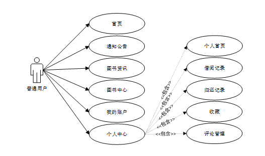 借书用户主要通过系统进行图书的搜索、借阅及归还操作,并管理个人账户信息。典型用例包括访问首页获取推荐书籍和最新资讯,利用图书中心功能根据关键词或类别搜索感兴趣的图书,并查看详细信息后提交借阅申请。此外,用户可以在个人中心管理自己的借阅记录、归还记录、收藏列表以及发表的评论,确保能够方便地追踪个人阅读历史并与其他读者交流心得。借书用户角色用例图如下所示。