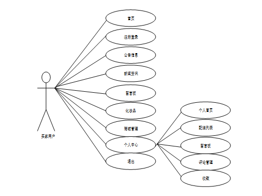 HTML5+Node.js的化妆品网站设计与实现中普通用户包含注册登录、首页、我的账户、、公告信息、新闻资讯、留言板、化妆品、商城管理、个人中心等功能模块,对应角色用例图如图3.1所示: