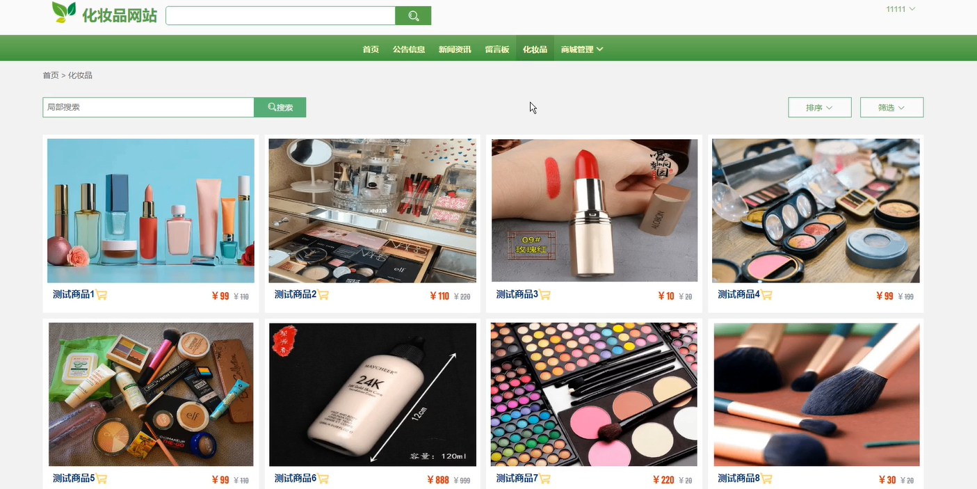 | 查询化妆品功能 | 点击化妆品:标题名称搜索框输入:产品名称,点击查询 | 化妆品成功过滤筛选出关键字为:产品名称的化妆品 | 信息成功过滤筛选出关键字为:产品名称的化妆品 | 通过 |