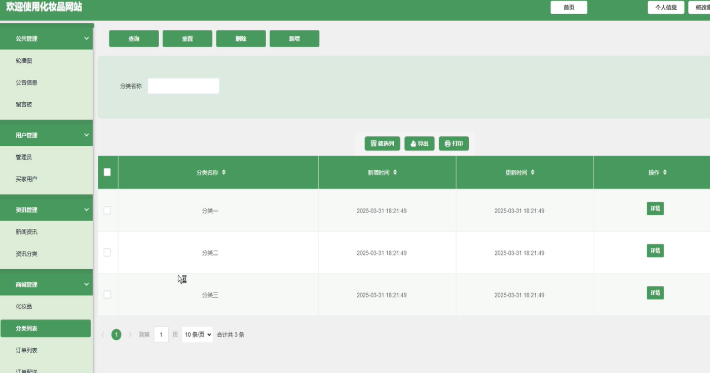 (5)商城管理:商城管理包含:化妆品、分类列表、订单列表、订单配送、订单售后等功能。化妆品:管理员可手动添加化妆品信息,添加的化妆品信息可在前台展示。可进行增删改查等操作。分类类表:管理员可查看分类列表详情。订单列表:管理员点击可查看订单列表详情。可进行查询、重置、删除等操作。订单配送:管理员可查看订单配送详情。可进行查询、重置、删除等操作。订单售后:管理员可查看订单售后详情。并对用户的申请售后进行审核。可进行查询、重置、删除等操作。