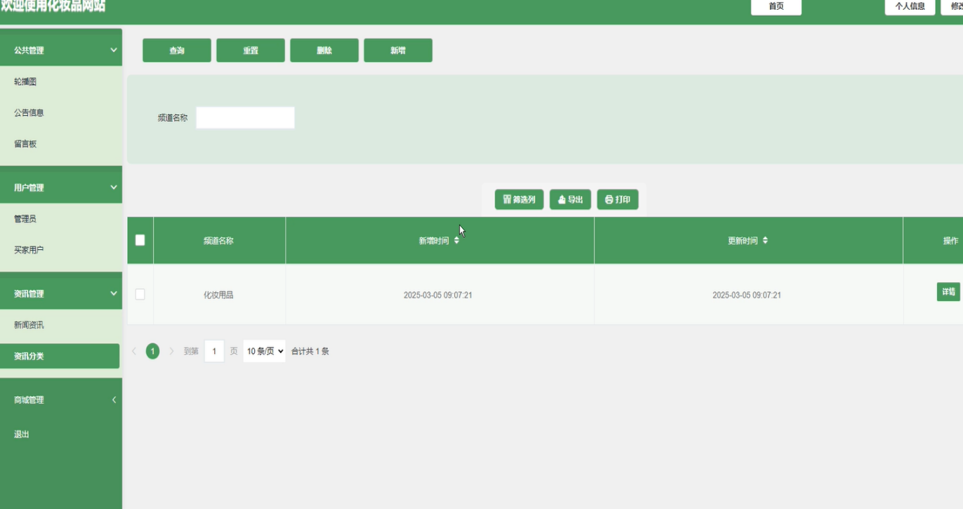 (4)资源管理:包含新闻资讯信息、资讯分类等功能,新闻资讯信息:管理员可查看添加的旅游资讯信息,可进行查询、添加、删除、筛选、重置、导出、打印详情等操作。资讯分类:可手动添加资讯分类信息。添加的信息可在前台展示。