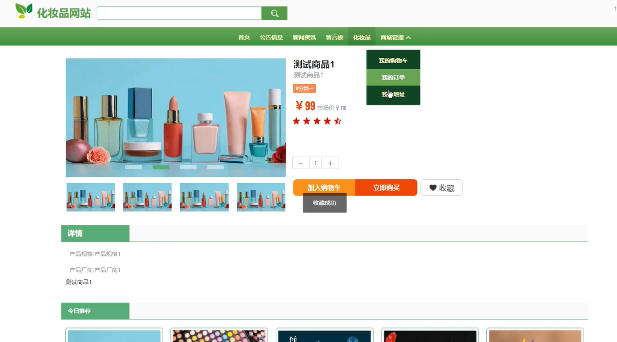 化妆品:展示后台发布的化妆品信息,可局部搜索,用户浏览到自己有喜欢的化妆品可以点击“购买”或“加入购物车”、没有收货地址的系统会提醒用户输入收货地址,有地址系统会跳到支付界面,用户可选择自己的支付方式进行支付。支付完系统自动形成订单,用户收到货有质量问题可申请售后,需后台管理员审核通过才能退货退款或者进行换货。点击信息可发表评论、点赞、收藏等操作。化妆品如图5-5所示。