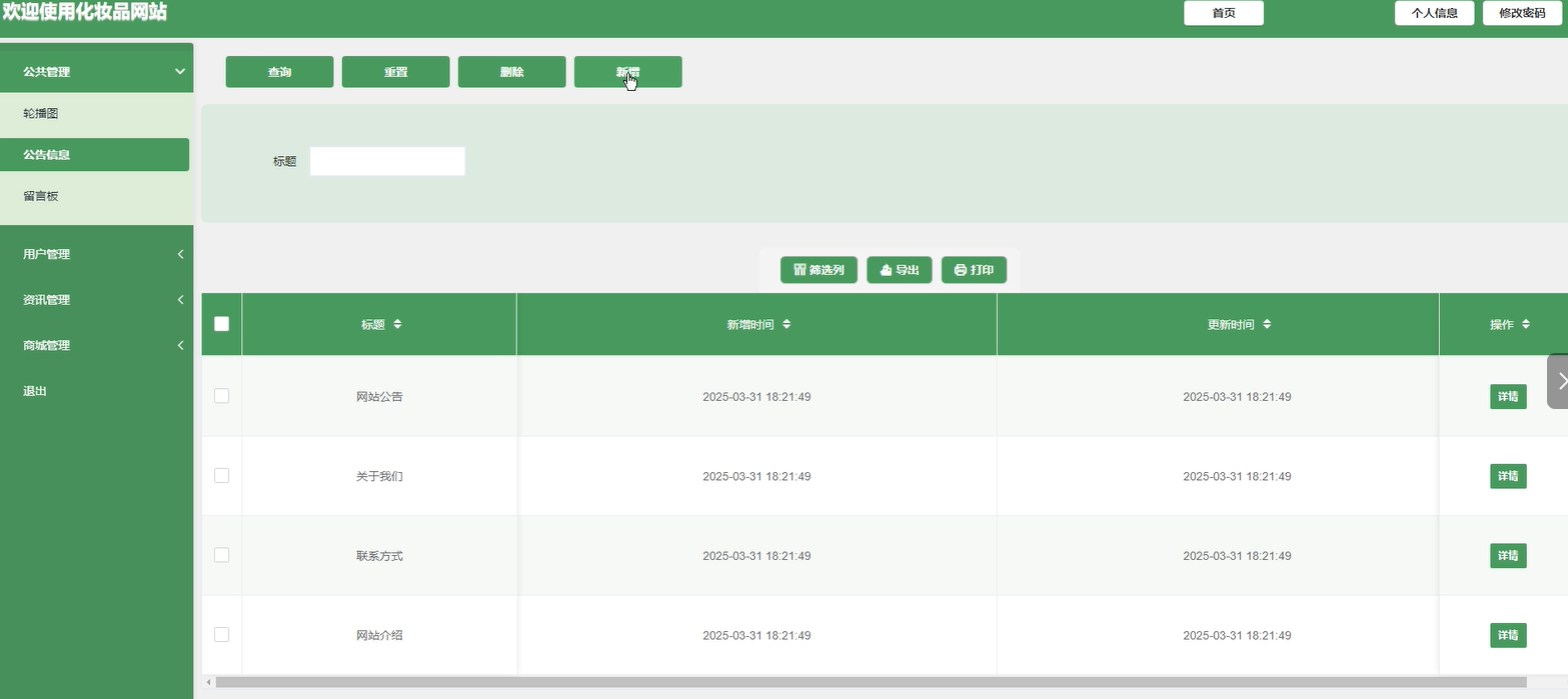 公共管理:主要是轮播图管理:管理员可以管理平台首页的轮播图内容,提供宣传和推广信息,可进行查询、添加、删除、筛选、重置、导出、打印详情等操作。添加的轮播图可在前台首页展示。公共管理如图5-9所示。