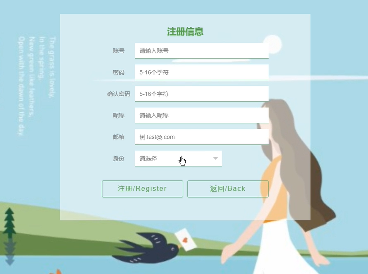 (2)注册:在用户注册页面中填写好账号、设置密码、确认密码、昵称、选择身份、手机号码、用户姓名等信息,点击下方注册按钮,提示注册成功后,系统将自动跳转回到首页。