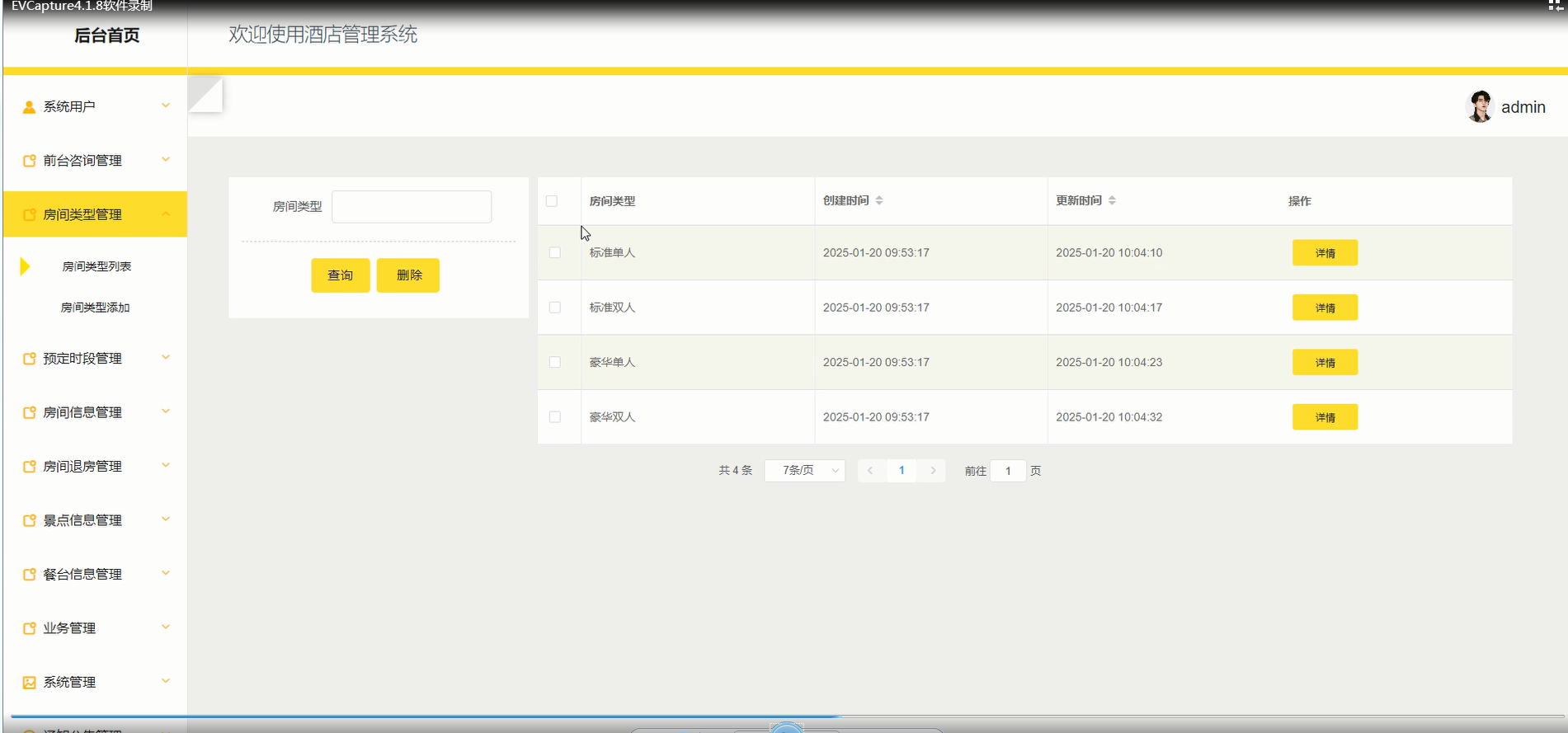 d) 房间类型管理:管理员可定义和维护房间类型(如标准间、套房),设置房型价格、配套设施及描述信息,支持灵活调整房型策略。