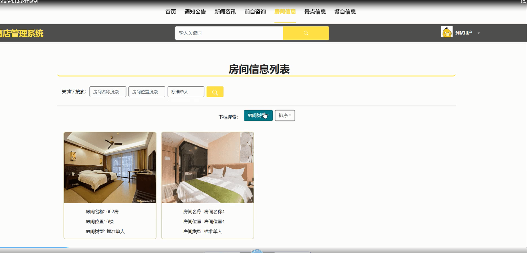 e) 房间信息:用户可浏览酒店所有房型详情(如价格、设施、图片),查看实时房态并进行在线预订。