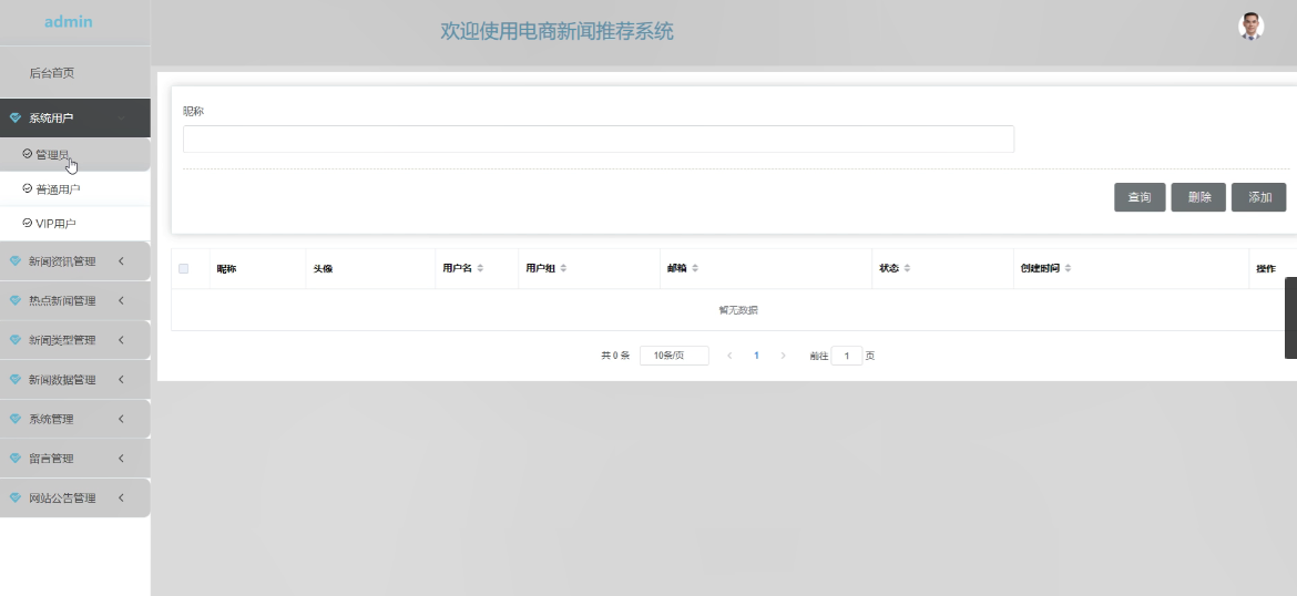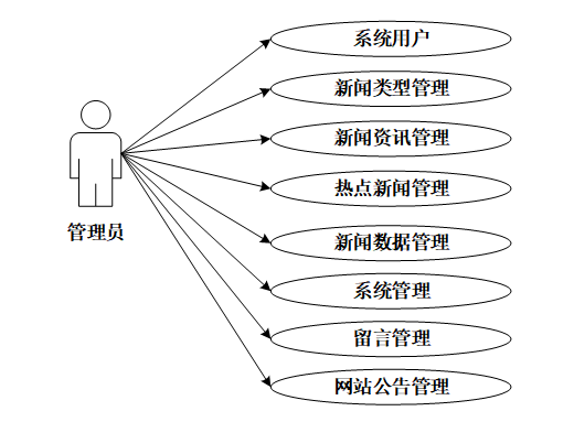 管理员可管理系统用户(管理员、普通用户、VIP用户)、新闻资讯管理、热点新闻管理、新闻类型管理、新闻数据管理、系统管理、留言管理、网站公告管理等。
