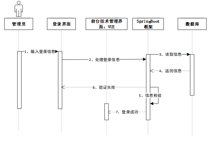 管理员输入登录信息后,登录界面将信息传递至前台管理界面,随后通过SpringBoot框架读取数据库中的用户信息并返回。系统验证信息,若验证成功则登录成功,若验证失败则返回错误提示。登录时序图如图4-4所示。