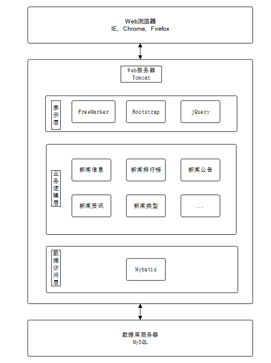 系统由表现层、业务逻辑层、数据访问层和数据库服务器组成。表现层通过浏览器(如IE、Chrome、Firefox)与用户交互,采用FreeMarker、Bootstrap、jQuery等技术实现界面呈现。业务逻辑层负责处理系统的核心业务逻辑,通过分模块设计实现功能分离。数据访问层使用MyBatis框架连接数据库,执行数据的增删改查操作。数据库服务器采用MySQL进行数据存储和管理,为系统提供稳定的数据库支持。整个架构通过Tomcat服务器完成用户请求的接收和处理,确保系统的高效运行[8]。整个系统架构如图4-1所示。