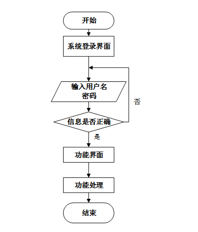 用户首先进入系统登录界面,输入用户名和密码后,系统验证信息是否正确。若验证失败,返回登录界面重新输入;若验证成功,则进入功能界面,执行相应功能处理后结束操作流程。操作流程如图3-5所示。