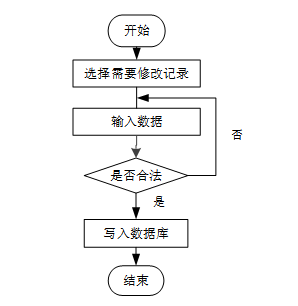 用户首先选择需要修改的记录,输入修改后的数据,系统判断输入数据是否合法。若数据不合法,提示重新输入;若数据合法,则将修改后的数据写入数据库,完成操作后流程结束。修改信息流程图如图3-7所示。