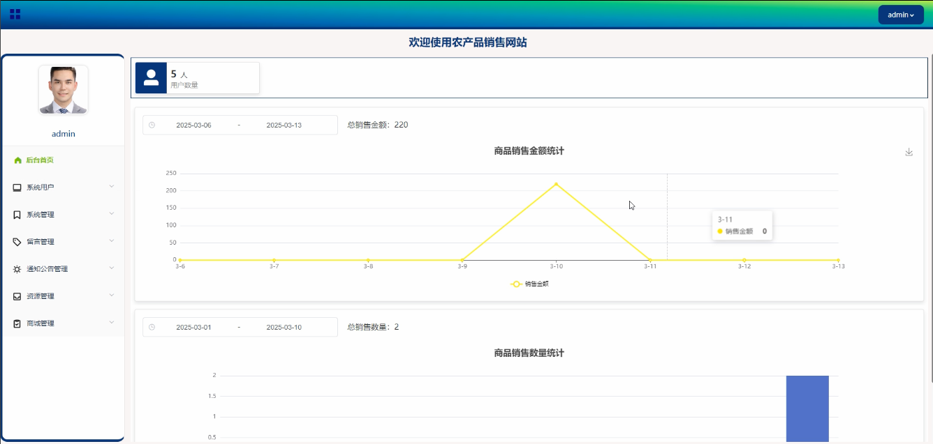 后台首页:管理员具备管理个人信息的权限,涵盖编辑个人资料、更换个人头像以及修改账户密码等多项操作,可以查看销售金额和销售数量的统计图。