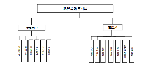 会员用户模块功能包括注册登录、首页、新闻资讯、通知公告、农产商城、顾客留言、商城管理、个人中心、我的账户;管理员模块功能包括后台首页、系统用户、系统管理、通知公告管理、商城管理、资源管理、留言管理。具体的功能模块图如图4-2所示。