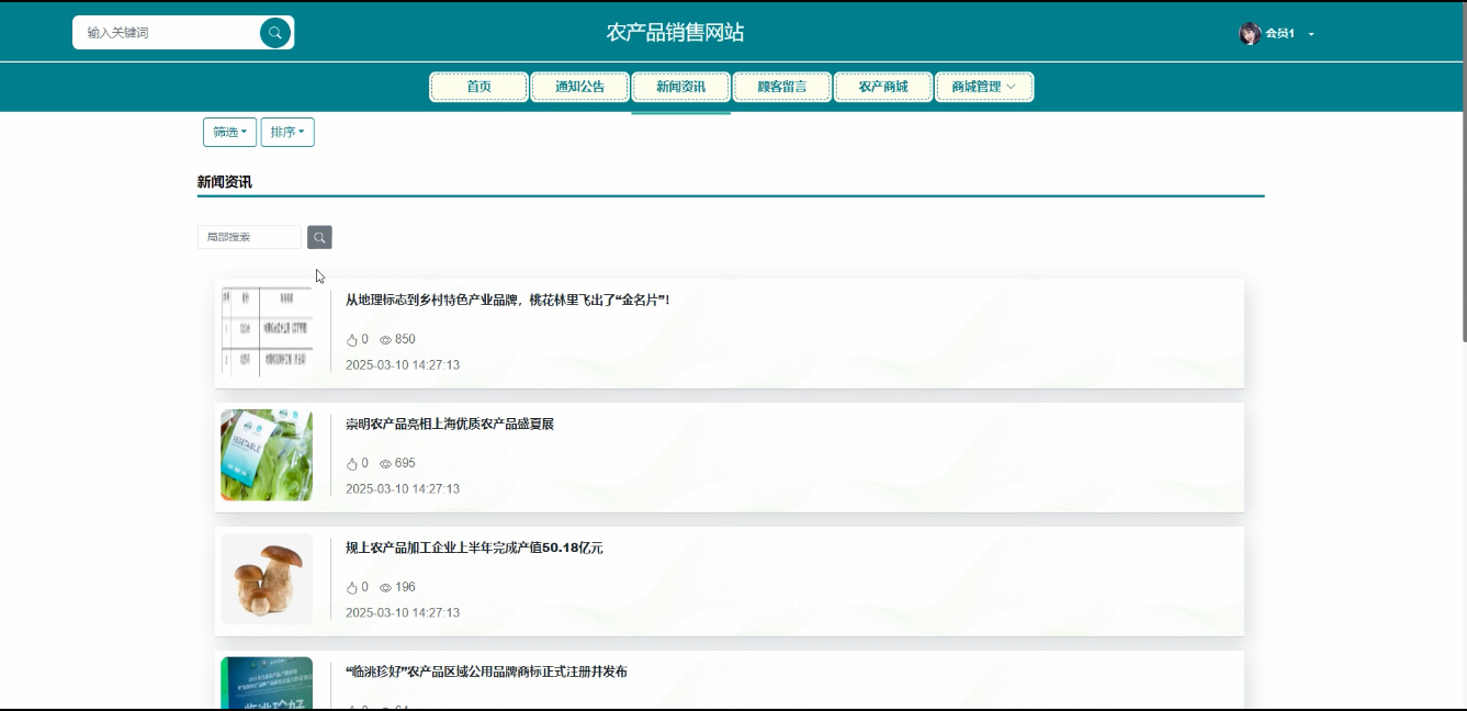 新闻资讯:农产品销售网站呈现新闻资讯列表,会员用户在浏览新闻资讯时可以评论、收藏、点赞。