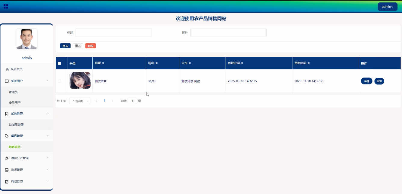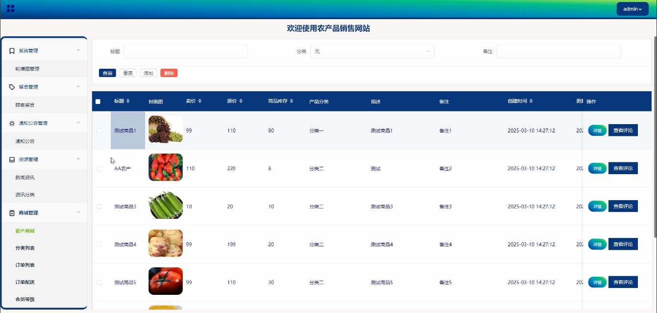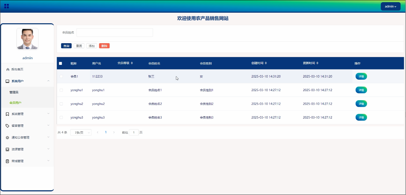 农产品销售网站功能方面,管理员模块功能包括后台首页、系统用户、系统管理、通知公告管理、商城管理、资源管理、留言管理。具体如下: