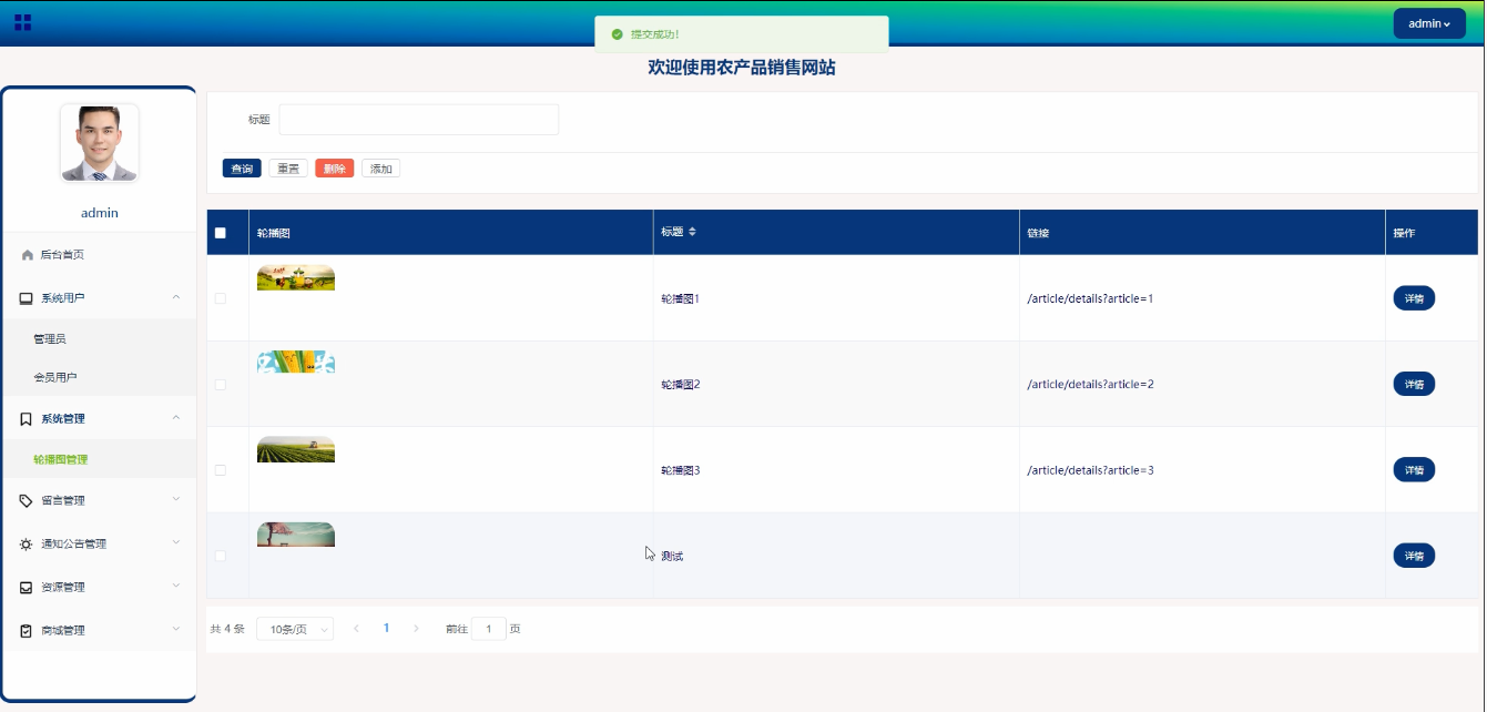 系统管理:管理员拥有查看和删除轮播图列表的权限,也可以填写内容和插入图片添加新的轮播图。界面如图5-13所示。
