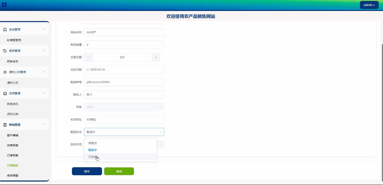 管理员拥有编辑、查看农产商城、分类列表、订单列表、订单配送、会员等级等信息列表,管理员可以在农产商城添加新的农产品信息,可以在分类列表里添加新的农产品分类,查看用户的订单列表和订单配送状态,并且可以设定等级会员及折扣力度。界面如图5-11所示。