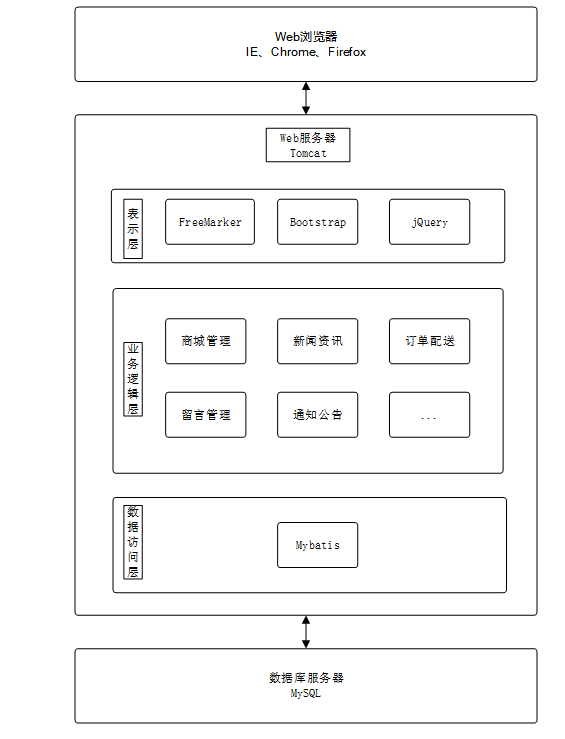 系统采用三层架构设计,包括表现层(前端)、逻辑层(后端)和数据层(数据库)。前端使用Vue.js框架构建,负责用户界面展示和与后端交互,提供农产商城发布、查询和更新等功能。后端使用JAVA语言和SpringBoot框架开发,负责处理业务逻辑、API请求以及与数据库的交互。数据层使用MySQL数据库存储用户信息、农产商城、公告等数据,确保数据的完整性和一致性。此架构设计具备高可扩展性、易维护性,并能有效应对高并发访问。系统三层架构图如下图所示。
