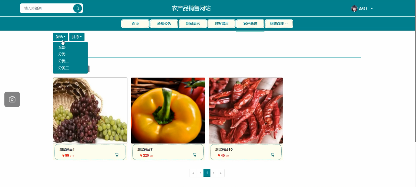 农产商城:会员用户点击“农产商城”,查看到农产品列表,对自己感兴趣的农产品点赞、收藏和评论,并且可以加入购物车或直接购买。