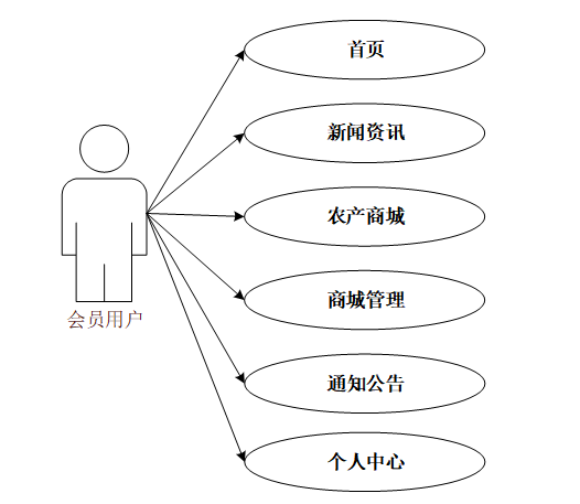 会员用户模块功能包括注册登录、首页、新闻资讯、通知公告、农产商城、顾客留言、商城管理、个人中心、我的账户,具体如下: