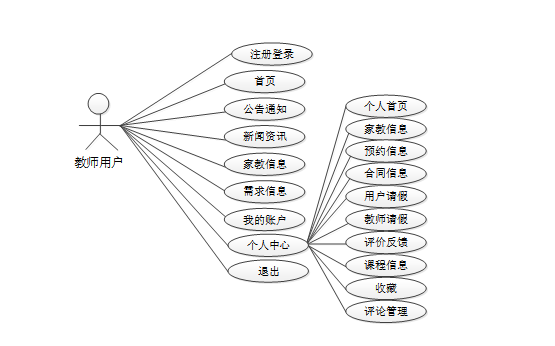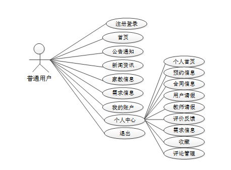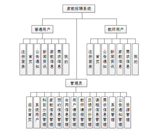 按照家教招聘系统的角色,主要包括普通用户、教师用户和管理员这三大用户功能模块,各用户功能模块的具体功能说明如下。