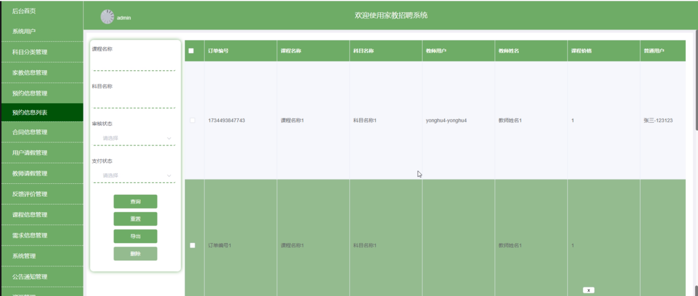 本系统采用了前后端分离模式进行开发,前端用户界面包括普通用户(家长或学生)和教师用户这两个主要角色,实现了用户注册登录、家教信息发布与搜索、需求信息发布和个人中心等核心模块。普通用户可以通过系统发布需求信息、查看家教信息、提交预约、支付费用以及提交反馈评价;教师用户则可以通过系统在线发布家教信息、添加课程详情、查看并审核用户的预约请求等功能。后台管理员模块主要负责用户管理、家教信息管理、需求信息管理、预约信息管理和系统设置等核心功能。设计开发此系统旨在提供一个便捷高效的家教预约环境,促进教育资源的有效配置,同时通过优化匹配过程和服务质量来满足家长和学生的多样化需求。