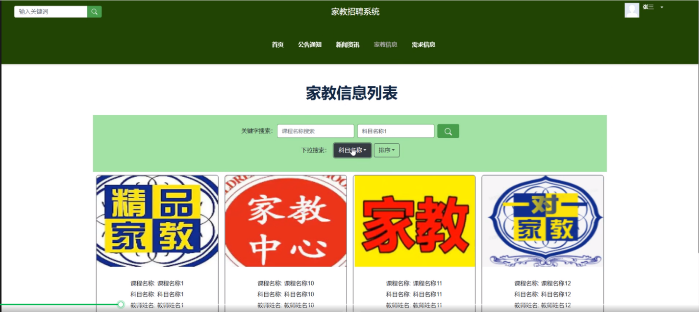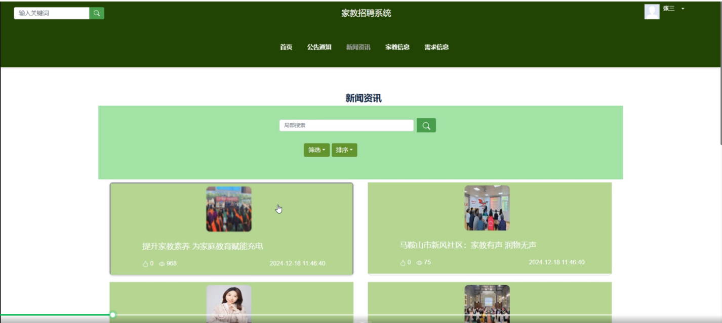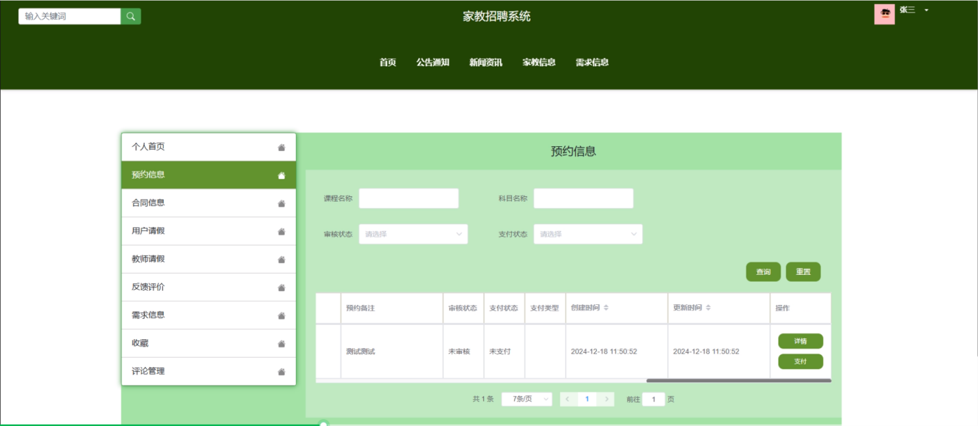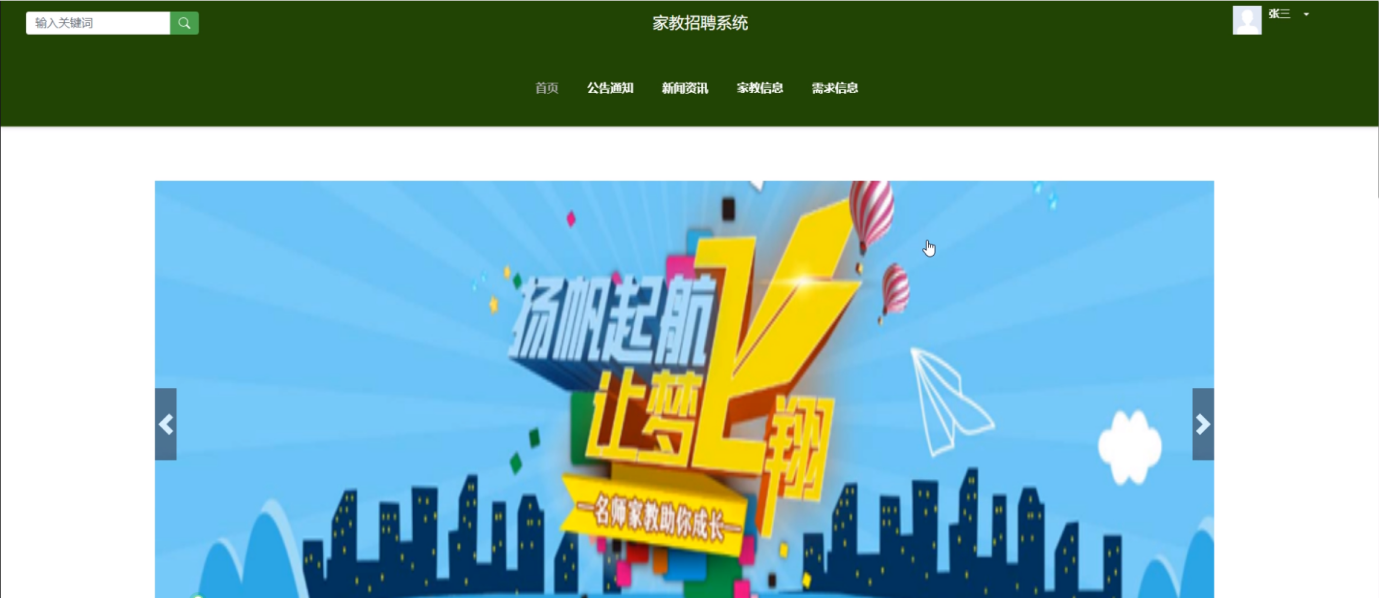 - 首页:用户可以查看首页展示的导航栏、轮播图、公告通知、新闻资讯、家教信息推荐等信息。