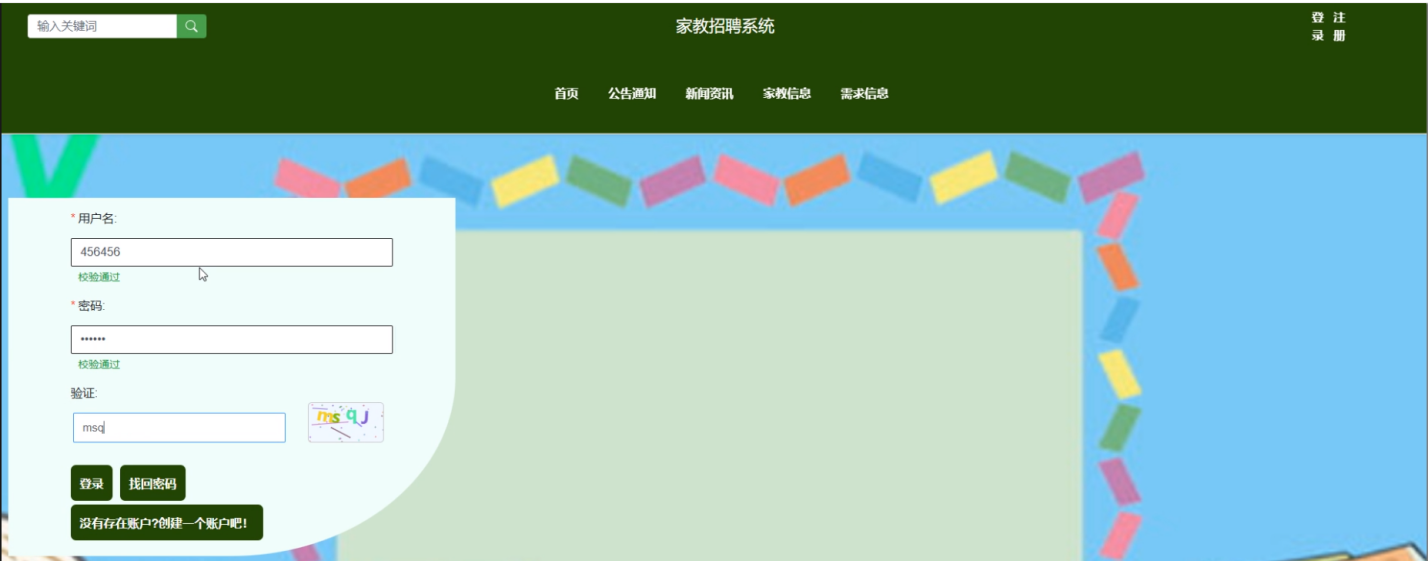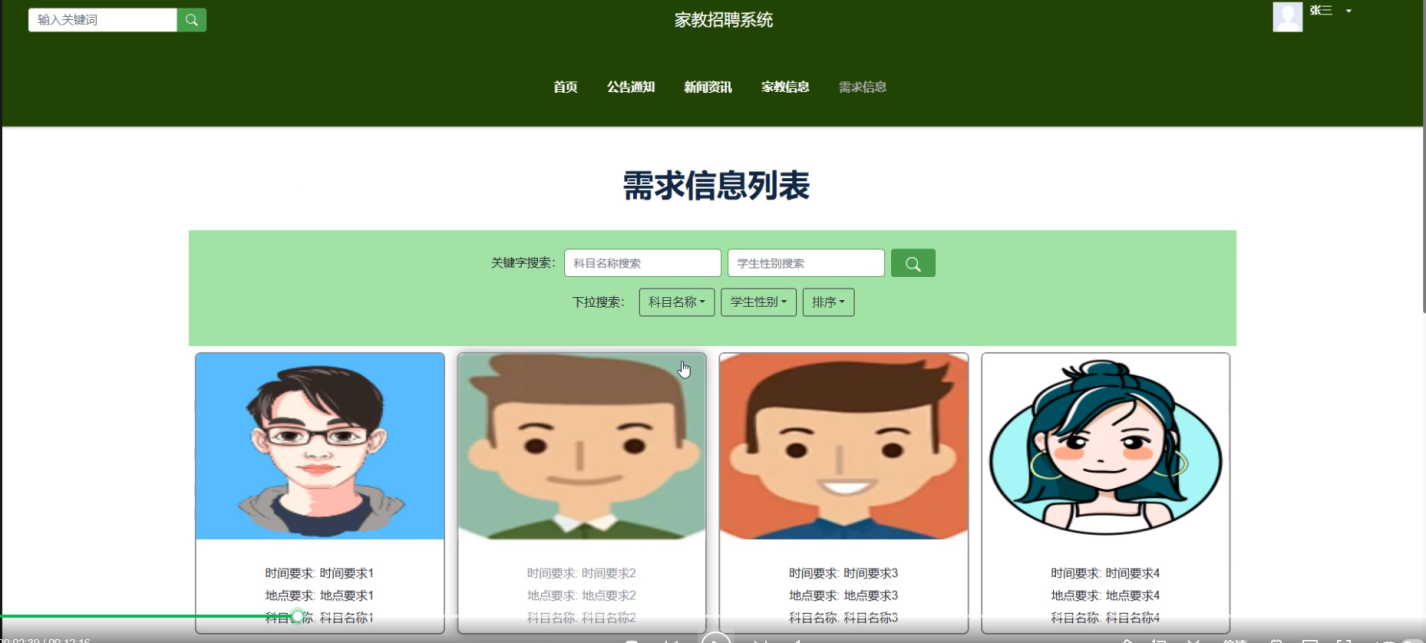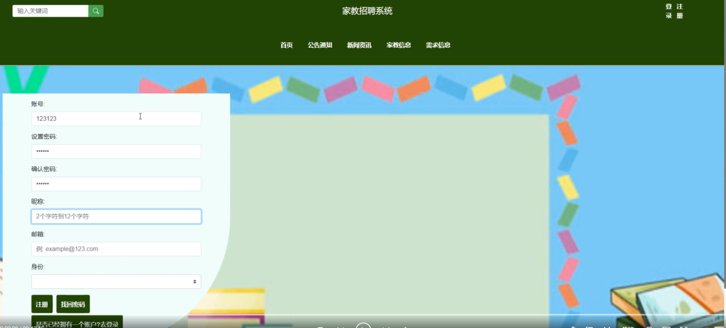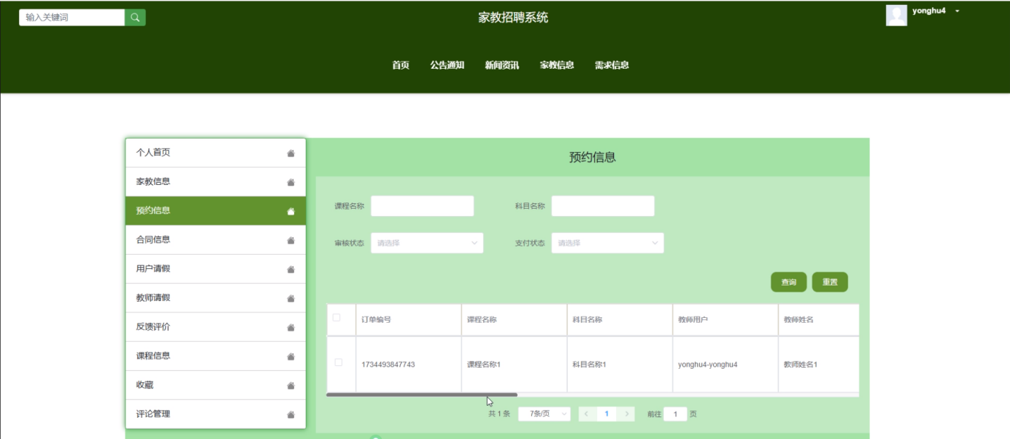 - 首页:用户可以查看首页展示的导航栏、轮播图、公告通知、新闻资讯、家教信息推荐等信息。