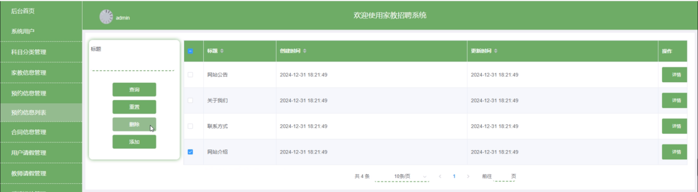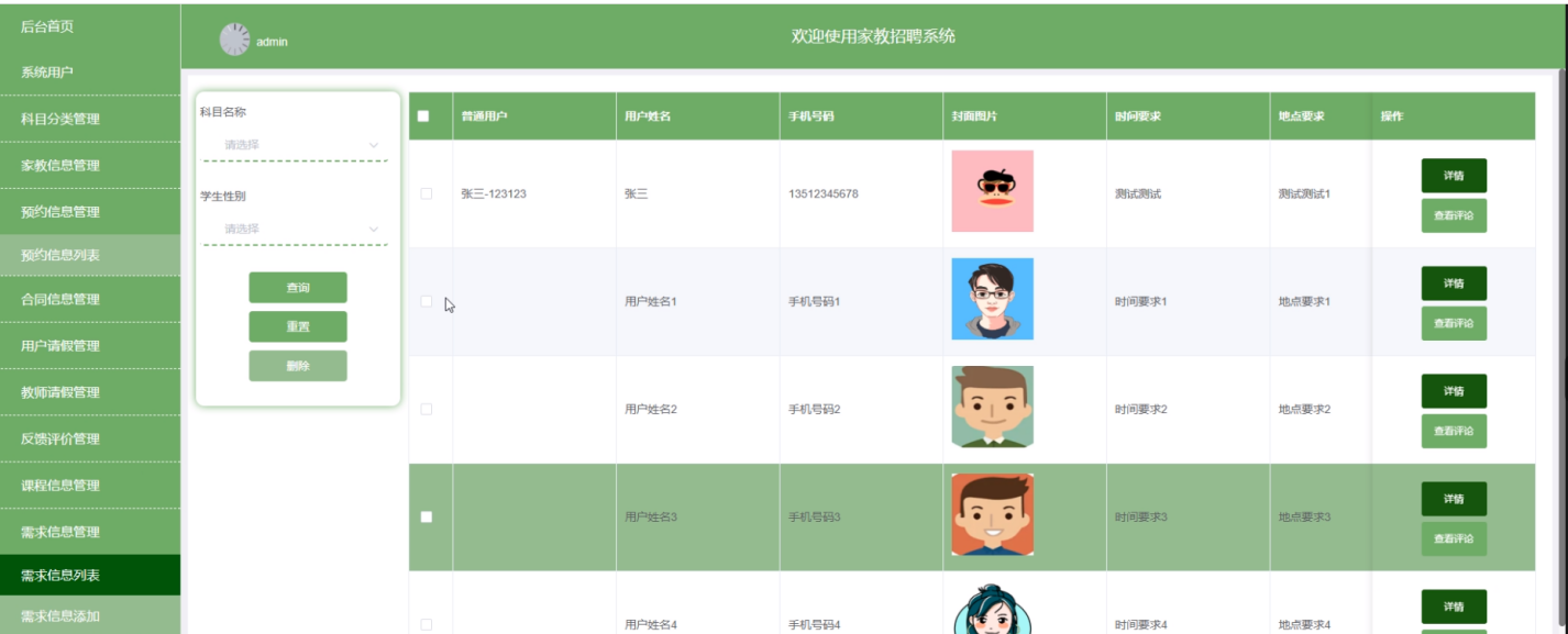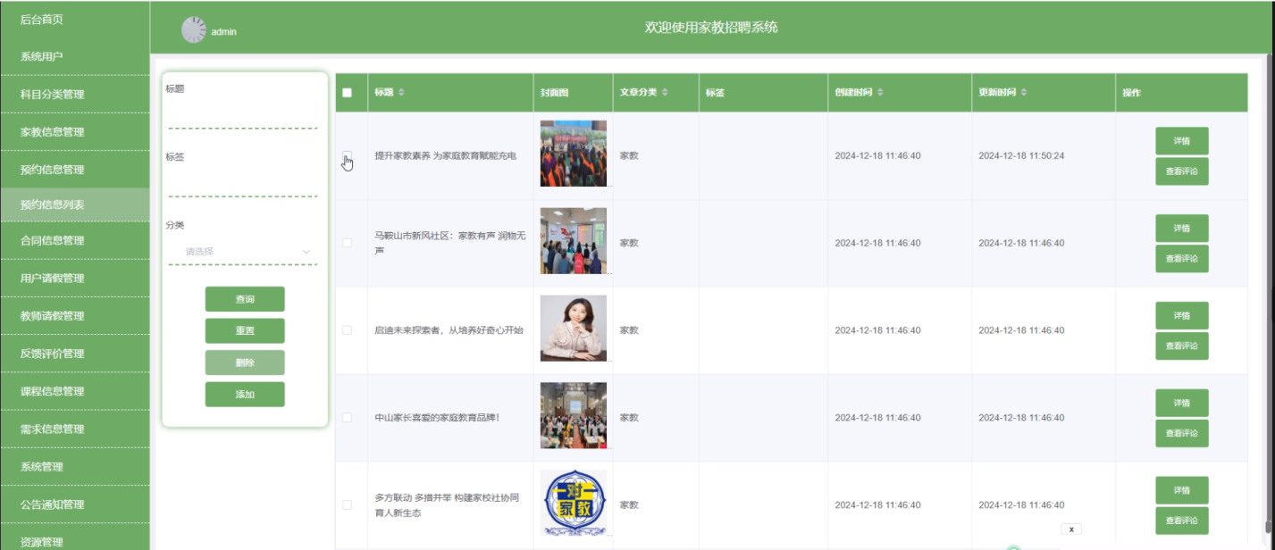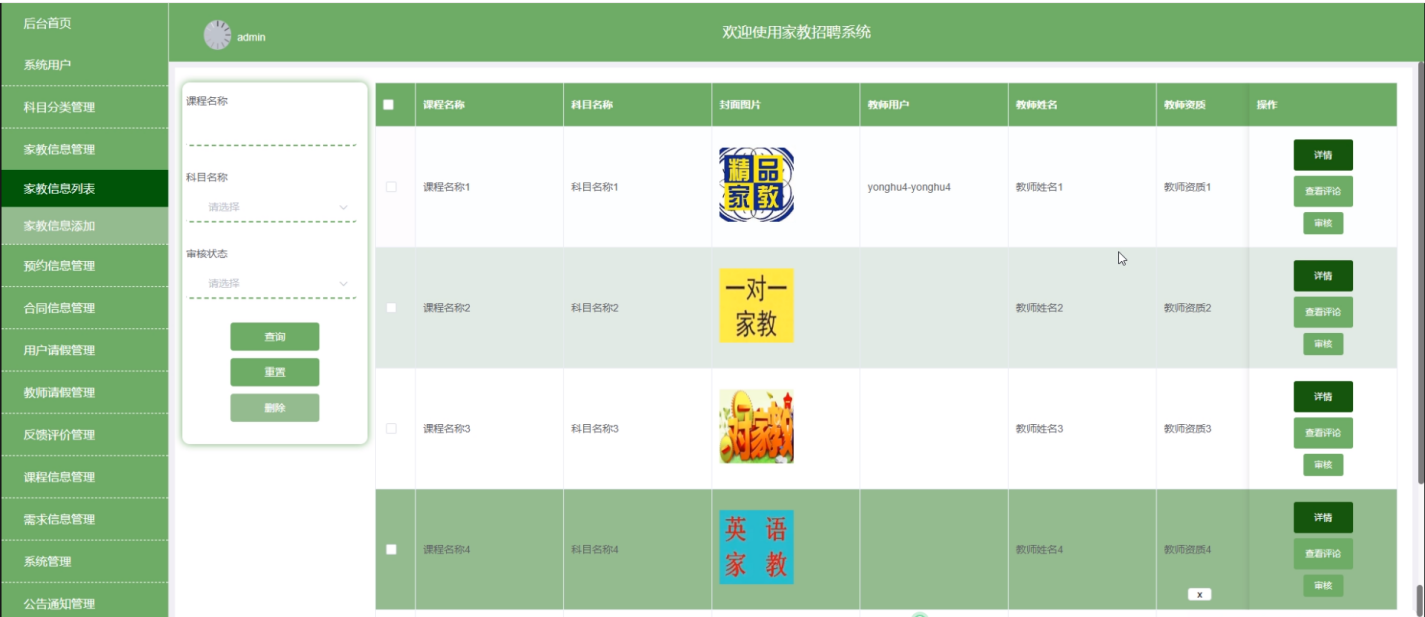 - 家教信息管理:管理员可以查看家教信息列表中某个教师用户提交的家教信息的详情并进行审核,点击评论可以查看用户对该教师的评论信息。