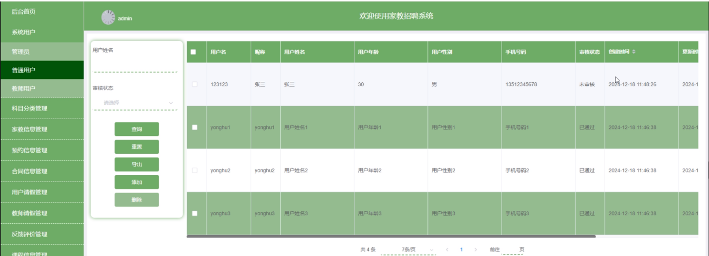 - 系统用户:管理员负责对新注册的用户信息进行审核,可以对所有用户(普通用户、教师用户、管理员)信息进行增删改查操作,点击“导出”可以导出用户信息。