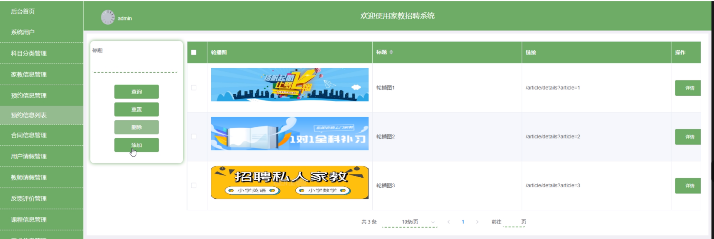 - 系统管理:在系统管理界面管理员对轮播图进行管控,可以对轮播图信息进行增删改查操作。