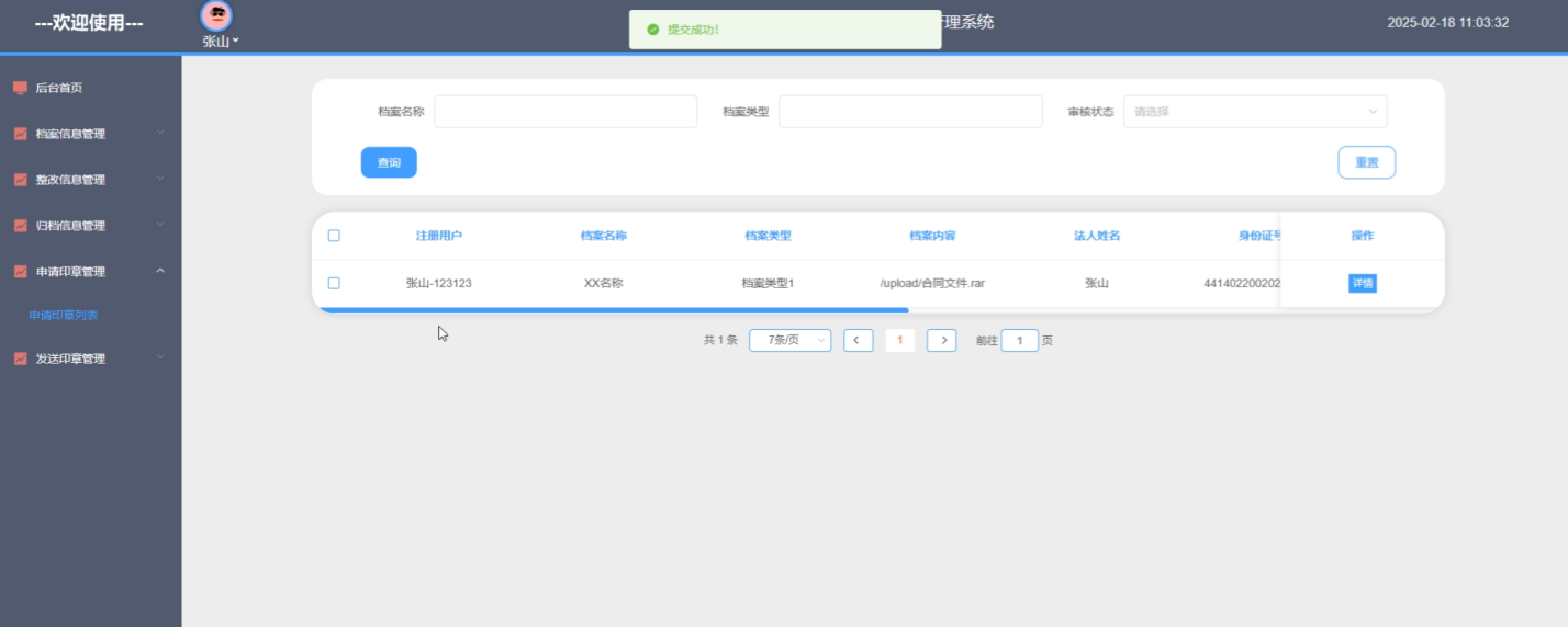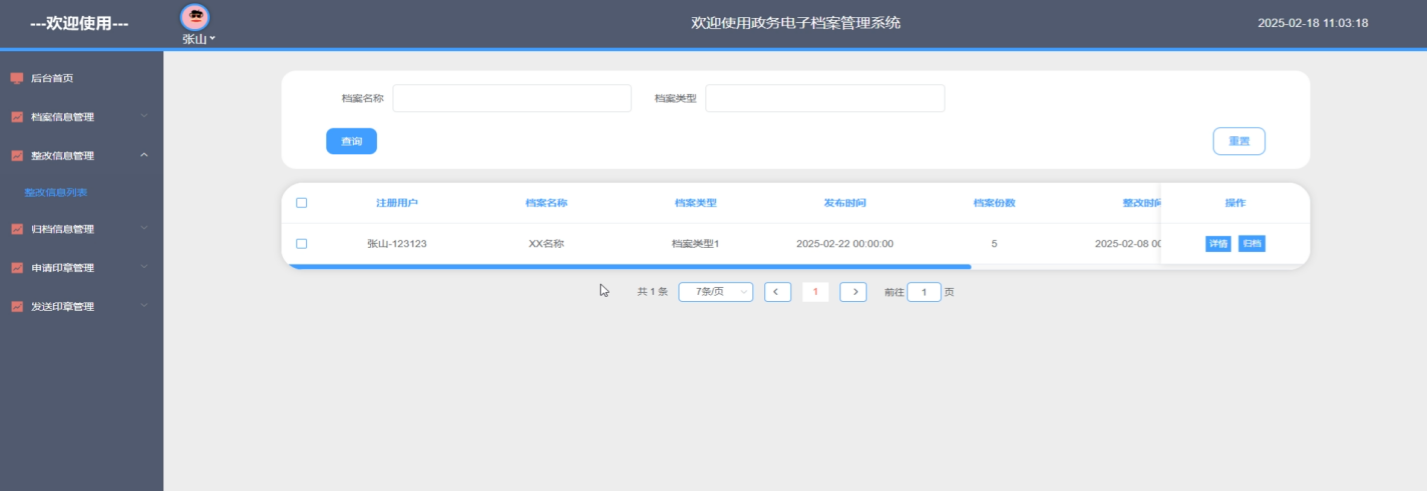 整改信息管理功能允许用户记录和跟踪档案的整改状态。每个档案的注册用户、档案名称、档案类型、发布时间、档案份数、整改时间可以在系统中更新和查看。用户可以跟踪整改进度,管理员可以审批并确认整改结果。其界面如下图所示。