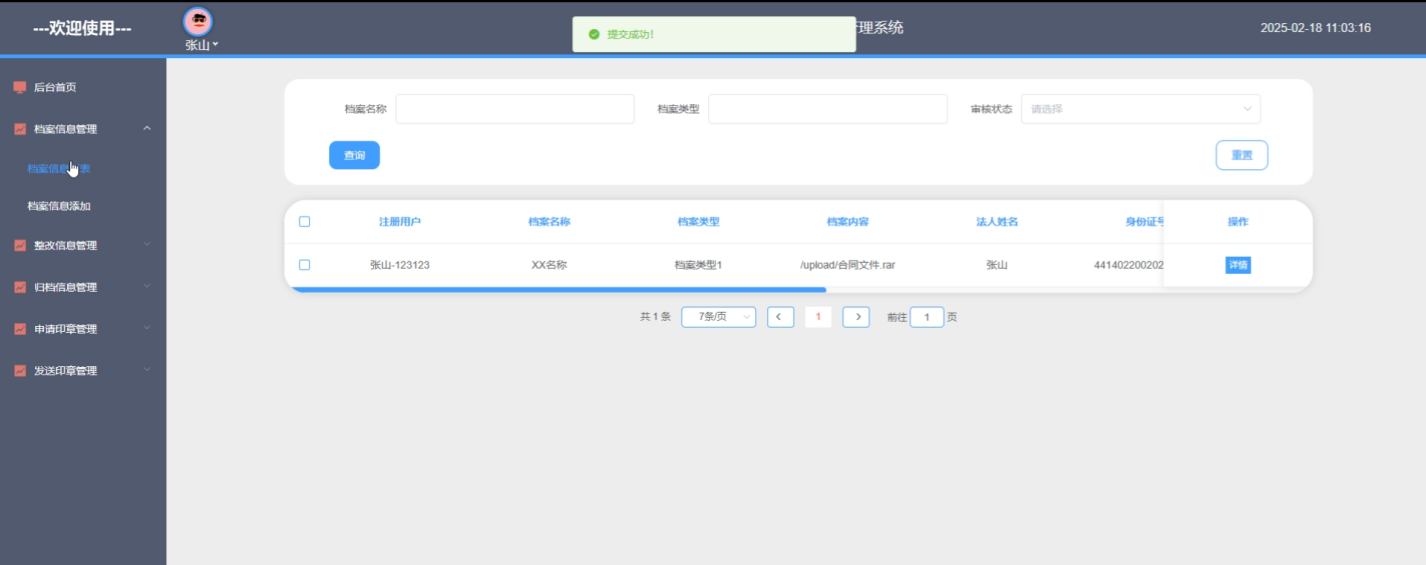 档案信息管理:档案信息管理功能允许用户录入、查询、编辑和删除档案数据。用户可以根据注册用户、档案名称、档案类型、档案内容、法人姓名、身份证号码等多个条件进行检索。