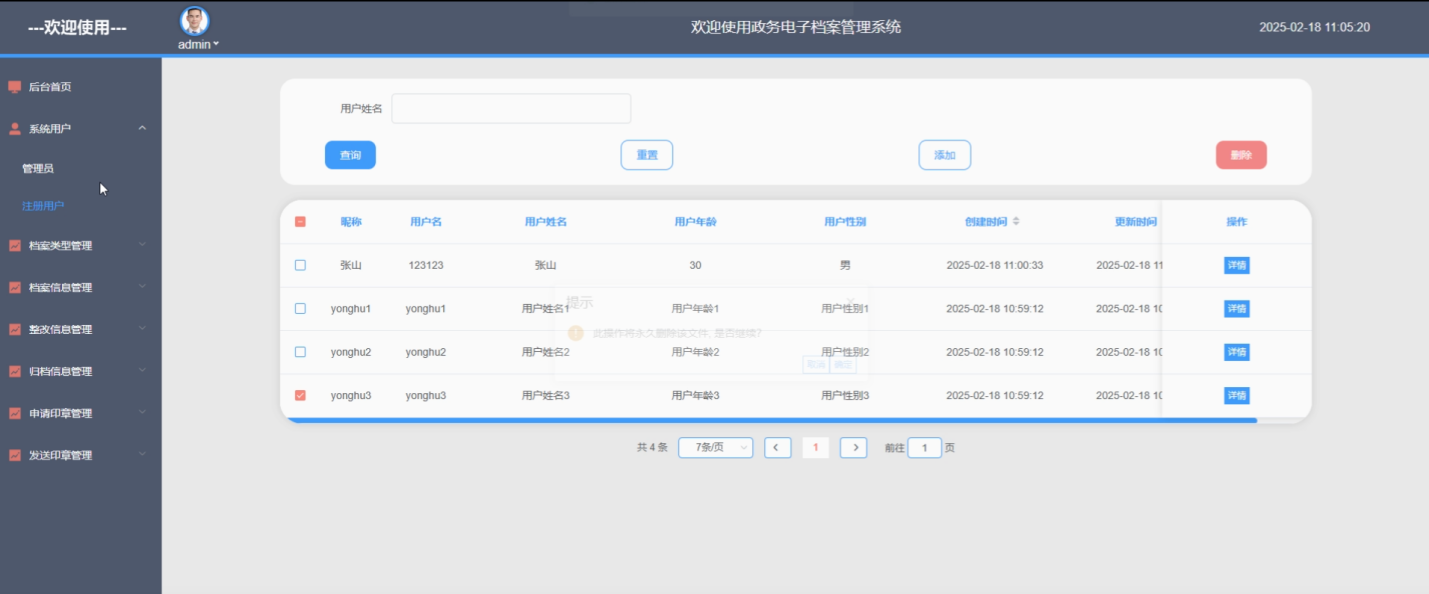 管理员需要能够查看、编辑和删除所有档案信息。该功能允许管理员对档案数据进行全面管理,包括录入新的档案、更新已有档案、以及删除不再需要的档案。其界面如下图所示。