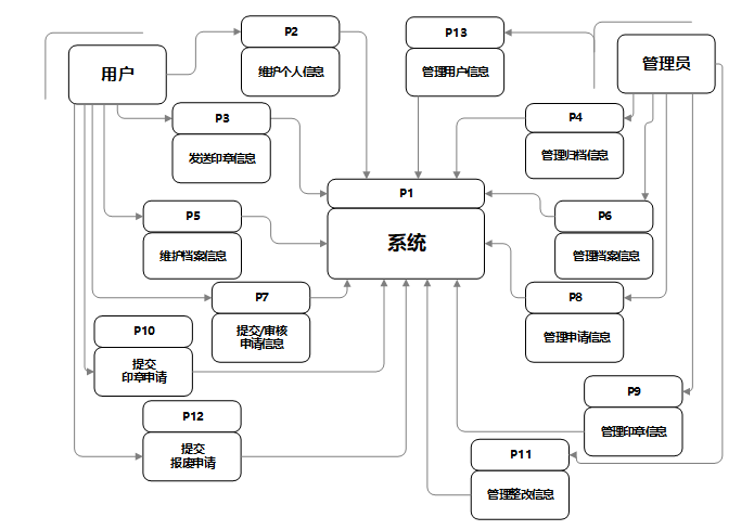 顶层数据流是指系统与外部实体之间的数据流动,描述了系统的整体数据流。在政务电子档案管理系统中,顶层数据流包括维护人员录入档案信息、普通用户查看档案信息、提交申请信息等。
