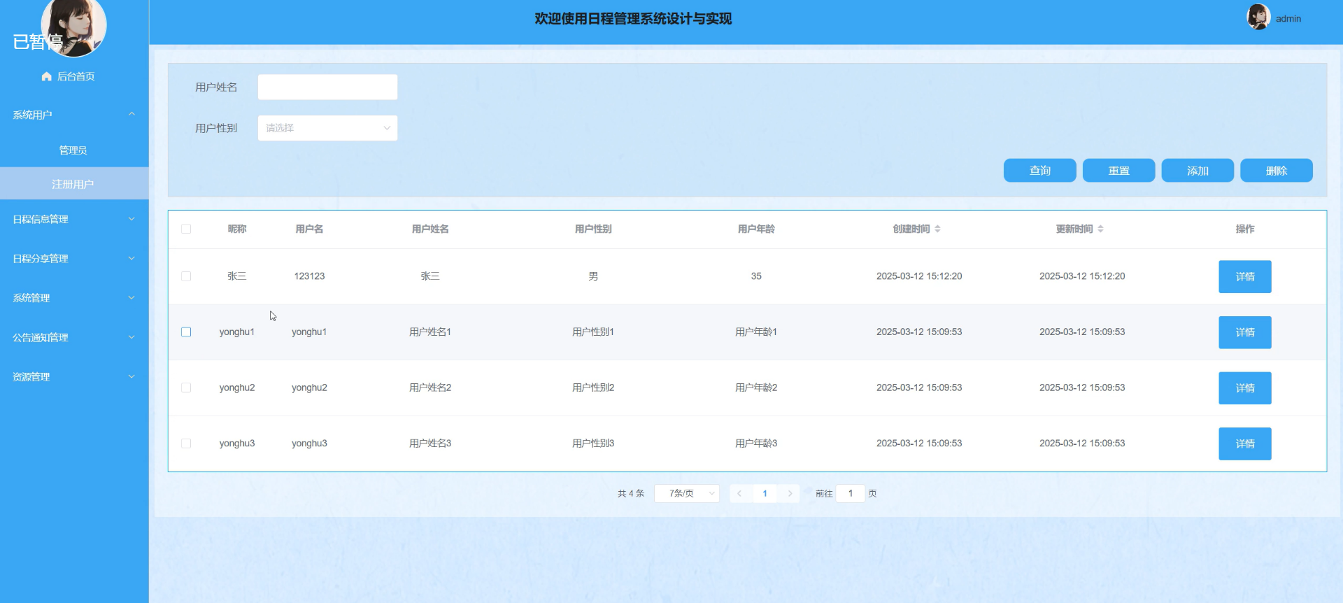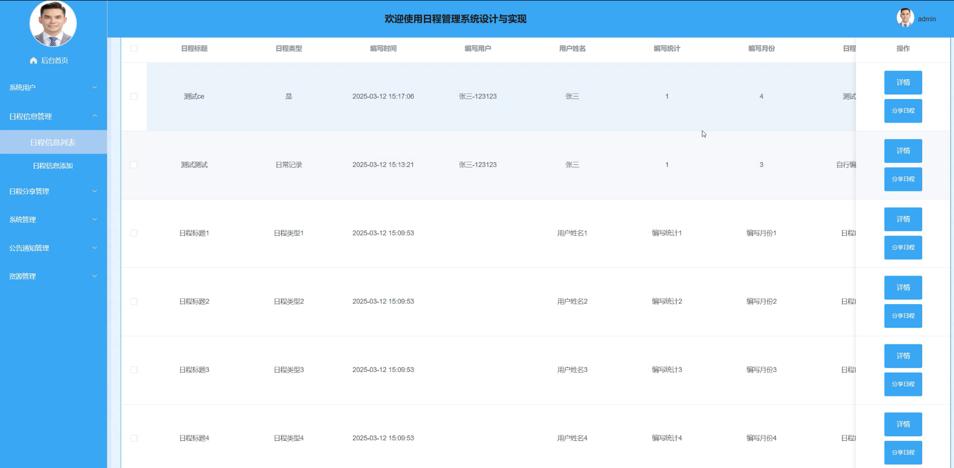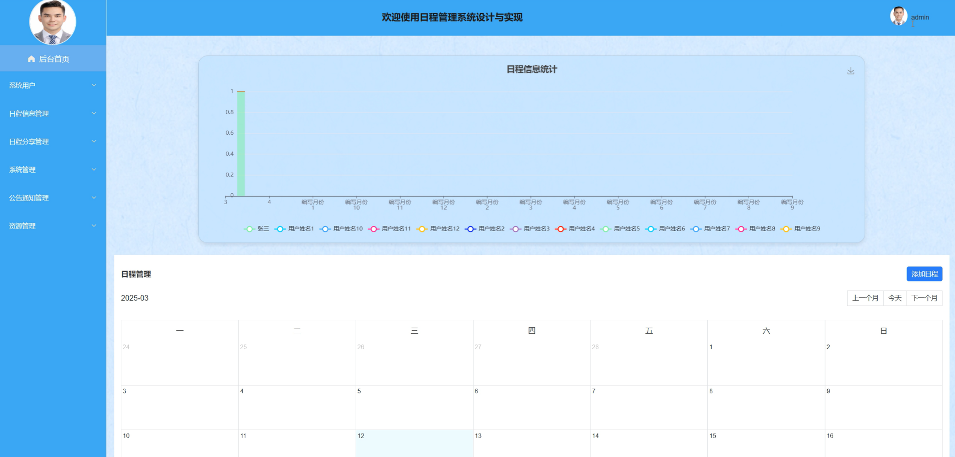 (2)功能模块设计与实现:系统分为管理员端和用户端,管理员端实现用户管理、日程信息管理、公告通知等功能,用户端提供日程安排、任务提醒、个人信息管理等功能,满足不同用户需求。
