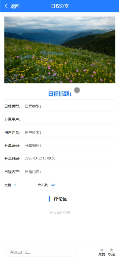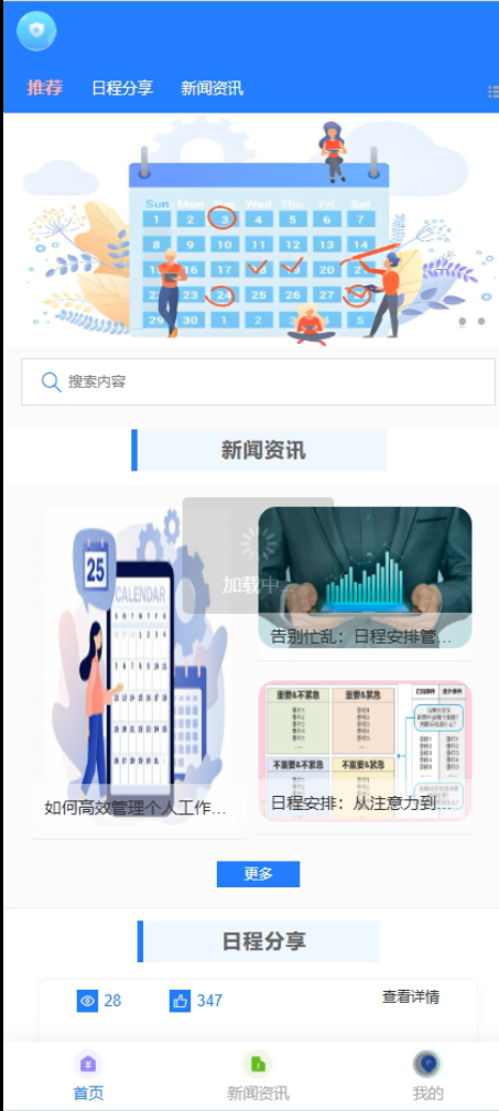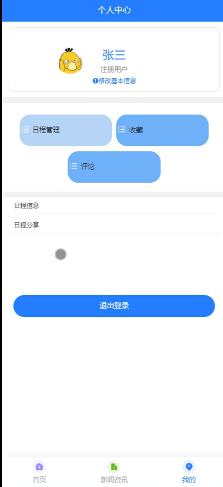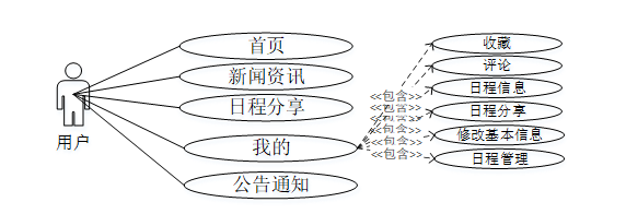 我的(日程管理、收藏、评论、日程信息、日程分享、修改基本信息):用户可以在“我的”页面管理个人的日程信息、收藏感兴趣的内容、发表评论、修改个人基本信息,以及分享自己的日程安排,便于个性化的管理和使用体验。