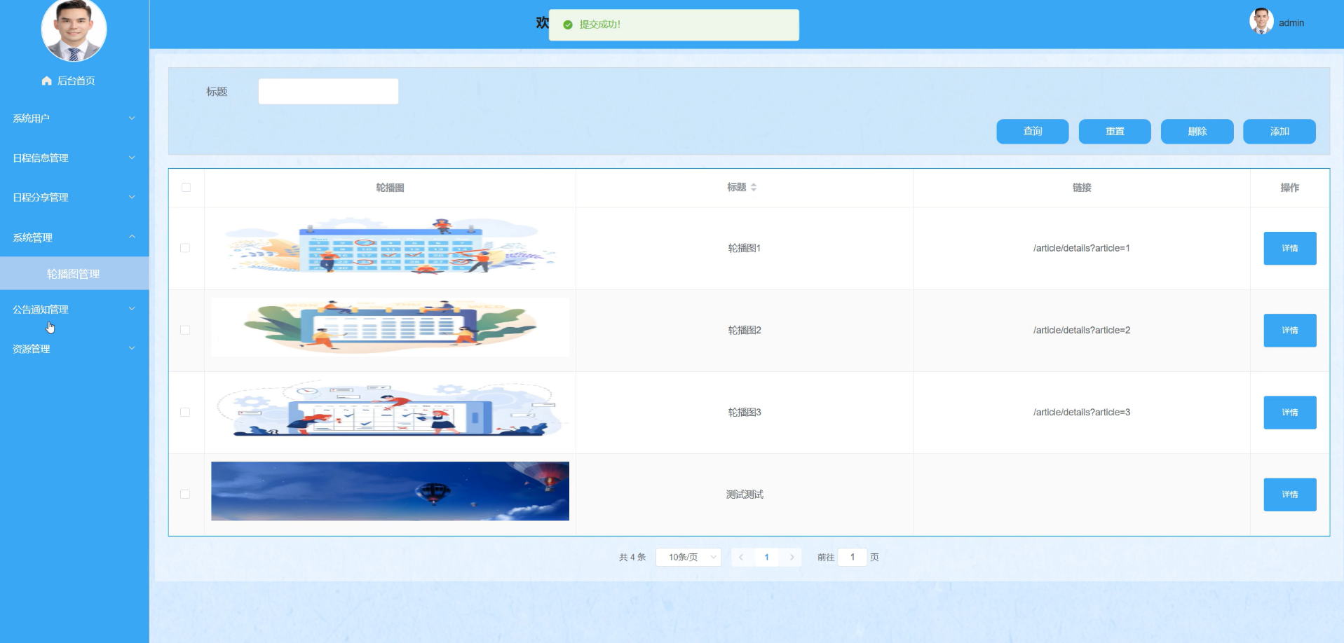 管理员可对网站首页的轮播图进行管理,上传新的图片或调整图片的显示顺序,以便于向用户展示重要的通知或活动信息。系统管理界面如下图所示: