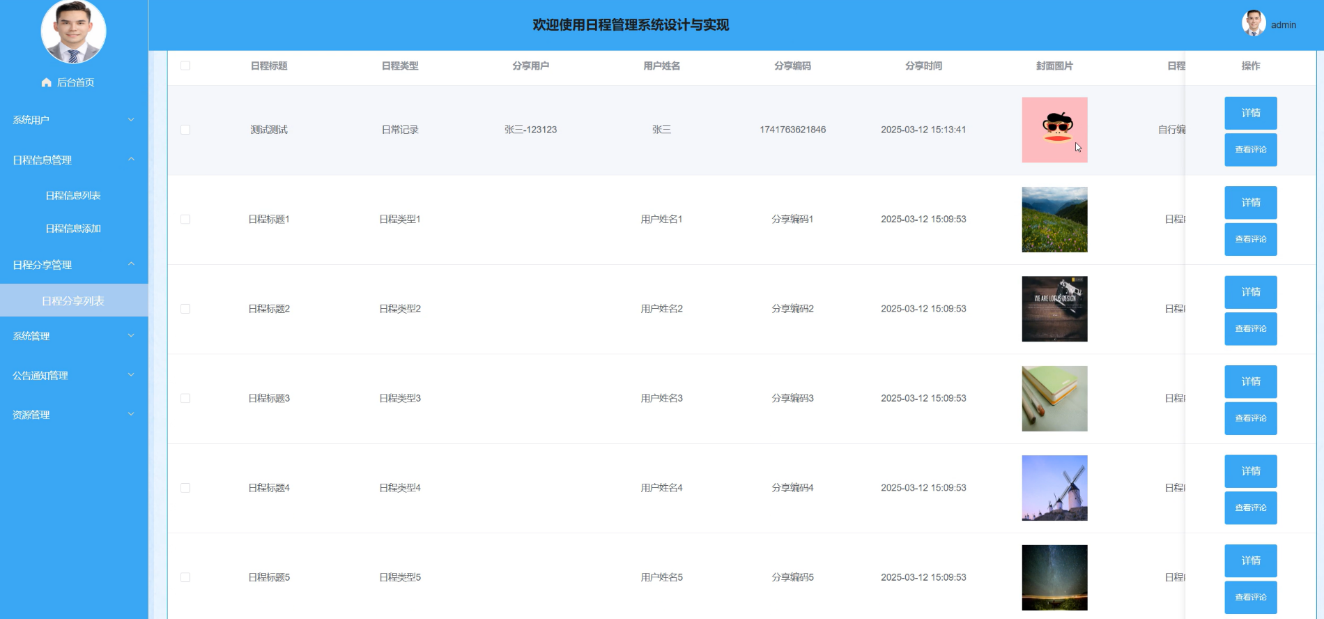 日程分享管理:管理员可以对用户分享的日程进行审核、管理和调整,确保共享的日程信息符合系统规范,促进用户之间的高效协作和信息交流。