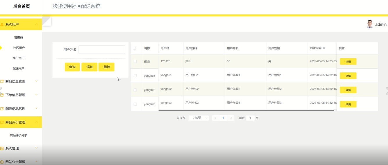 3.系统用户管理:管理员可以管理所有平台用户的信息,包括社区用户、商户、配送用户和其他管理员。